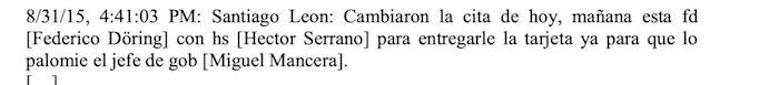Ese texto corresponde a un extracto de la demanda que después del robo de Taxinet, Luis Noboa interpuso contra Santiago León. En el mismo documento se puede leer una conversación de WhatsAap en donde Santiago León confirma que Döring se reunirá con Héctor Serrano para entregarle un documento “ya para que lo palomie el jefe de gob” [sic] haciendo referencia a Miguel Ángel Mancera.