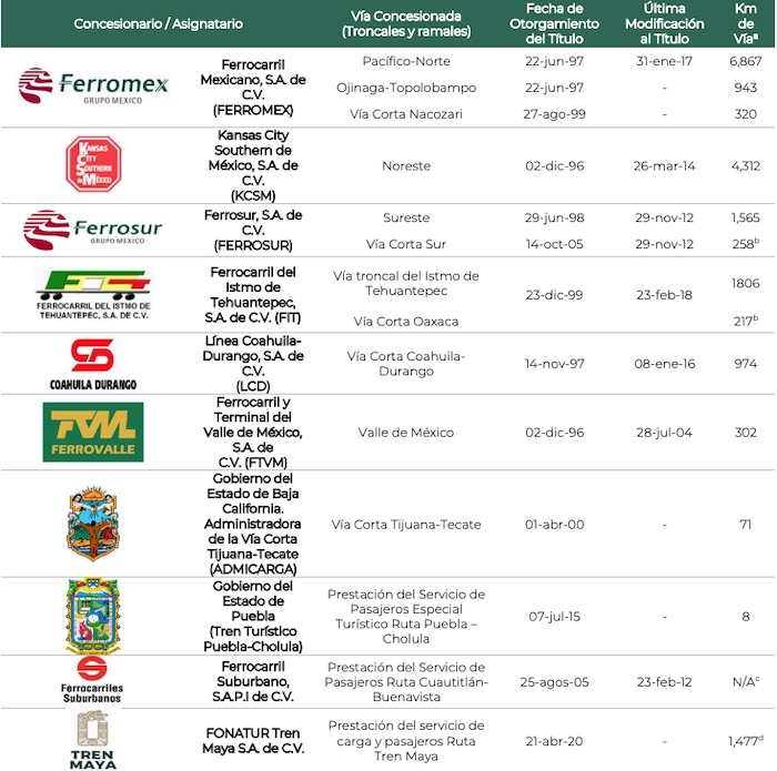 Concesiones ferroviarias desde los noventa a la fecha. Tabla: Agencia Reguladora del Transporte Ferroviario, 2021.
