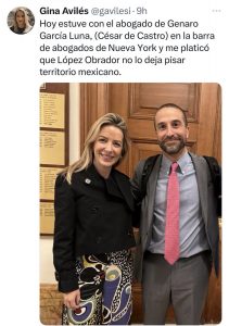 El mandatario se refirió a una foto de Gina Avilés con De Castro. La mujer es esposa de Ilan Katz Mayo, abogado del bufete Katz y Gudiño, quien según AMLO "siempre ha estado en contra de nosotros". En el mensaje, la esposa del abogado publicó que el abogado de García Luna le había platicado que "López Obrador no lo deja pisar territorio mexicano".