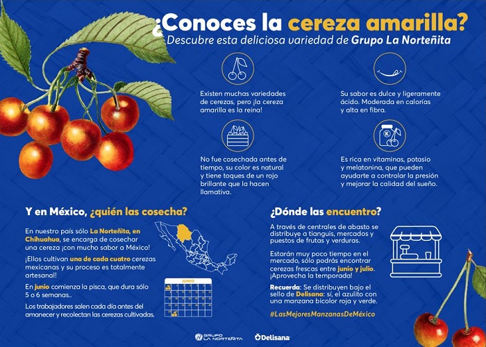 Ciudad de México, 28 de mayo (SinEmbargo).- En Chihuahua existen alrededor de 25 hectáreas destinadas a la producción de cerezas, sin embargo, la mayoría de las cerezas que se consumen son rojas y provienen del mercado internacional. Las cerezas amarillas son una joya dorada entre las frutas: su piel es suave y amarilla, en ella resaltan algunos toques de color rojo brillante que le dan una apariencia única, su pulpa es jugosa, sus notas de sabor son una composición de dulzura y un toque de ligera acidez. Cada mordisco es una promesa de felicidad y una invitación a disfrutar el romance de la naturaleza.
