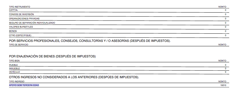 Con el apoyo a personas de la tercera edad de 19 mil 310 pesos, el monto total de su percepción anual fue de un millón 716 mil 391 pesos.