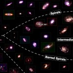 Hay galaxias de todas las formas y tamaños: desde aquellas que tienen densos bulbos o barras centrales a las que están rodeadas por brazos en espiral. El astrónomo Edwin Hubble las clasificó en un diagrama conocido como el Diapasón de Hubble.