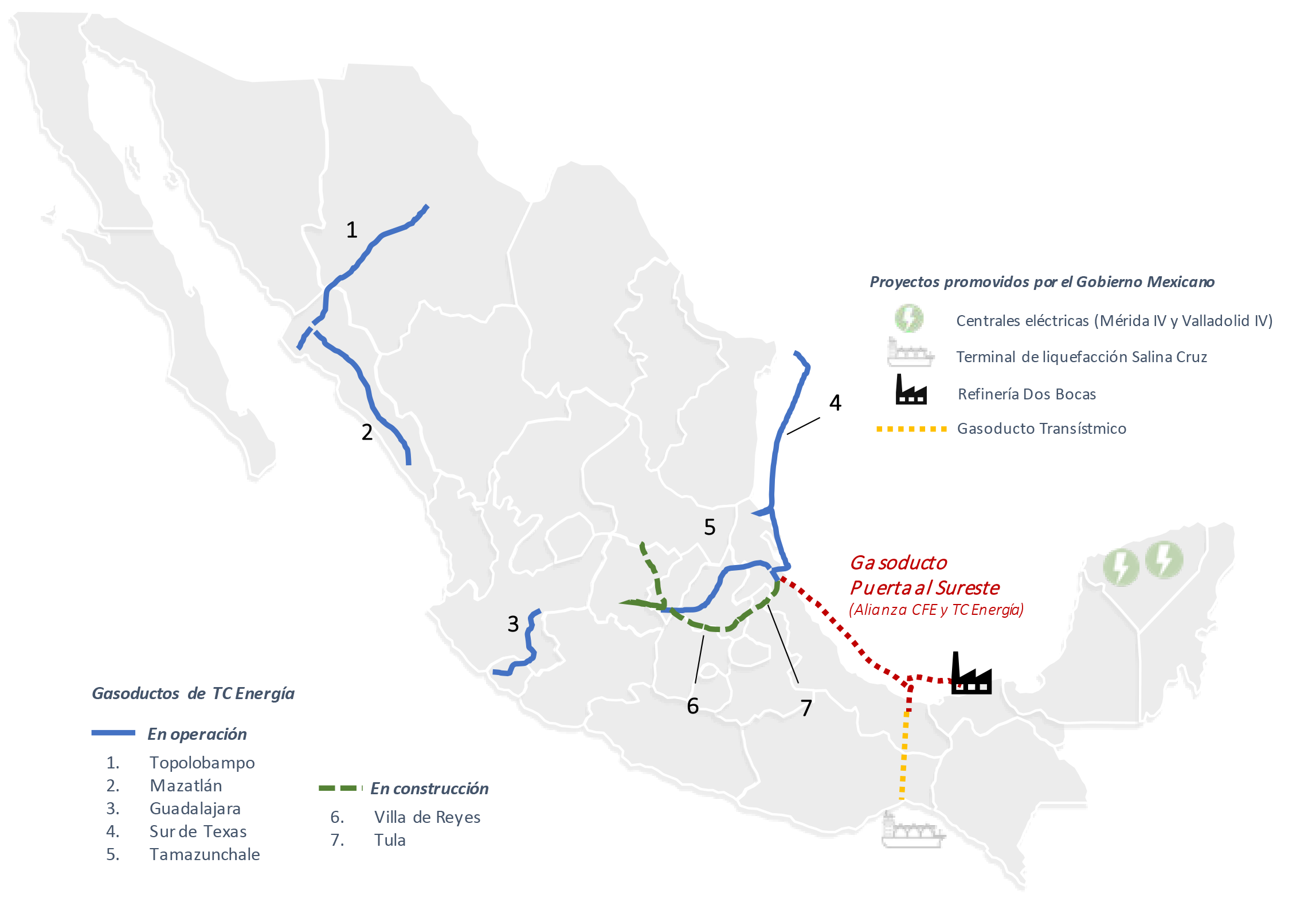 El proyecto de gasoducto Puerta al Sureste, el cual está en desarrollo en conjunto por la empresa canadiense TC Energía y la Comisión Federal de Electricidad (CFE), tiene una longitud de 715 kilómetros diarios y pretende transportar mil 300 millones de pies cúbicos de gas natural diarios hacia la región sureste de México para el 2025. La inversión al momento ha sido de 4.5 mil millones de dólares, de acuerdo con la página de la compañía energética.