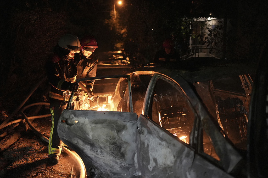 Socorristas tratan de apagar un auto que se incendió por la caída de escombros tras un ataque aéreo ruso en el distrito de Pecherskyi, en Kiev, Ucrania, el martes 30 de mayo de 2023. Foto: Roman Hrytsyna, AP.