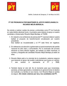 "Ricardo Mejía está a la voluntad de la ciudadanía. Estamos segurod de que tenemos el apoyo del pueblo coahuilense que busca un cambio. Y ese cambio los representa el PT y RMB", señaló el partido.
