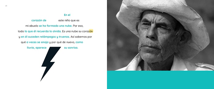 También hay que destacar que el libro está lleno de hallazgos, las imágenes brotan de él casi sin cesar: si las manos de la abuela son “como de mandarina” (página11) entonces la voz lírica y con ella todos los lectores, somos “un gajito de fruta” (página 11) cuando la abuela nos abraza, o el hecho de que “el abuelo (use) sombrero para que el sol no le robe los recuerdos” (página 17), nos presenta a la memoria como el acto de conciencia y de afirmación de que estamos vivos, de que estuvimos vivos alguna vez. En otro poema, la autora agrega: “En el corazón de este niño que es mi abuelo se ha formado una nube. Por eso, todo lo que él recuerda, lo olvida” (página 20) y cuando esto ocurre, el testimonio de que se estuvo vivo puede ser la descendencia, los hijos y, por supuesto, los nietos.
