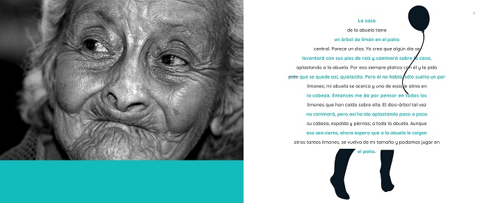 Desde el primer poema titulado “La casa”, la autora logra abrir una puerta hacia lo entrañable de la figura familiar que constituyen los abuelos. En el texto se materializa al tiempo como a un limonero en el patio, un árbol que se agiganta y va tirando frutos como días sobre la cabeza de la abuela. Lo interesante de la elección de un limonero es que se trata de un árbol aromático, todo en él es perfume: el tallo, las hojas y, por supuesto, los blancos y minúsculos azahares. Siguiendo la propuesta del poema, el tiempo es también aroma y es fruto, una idea que sin duda deja al lector pensando y sintiendo a tope antes de pasar la página, y cuando esto sucede, la idea y la imagen del árbol continuá allí, pero ahora la figura central es la del abuelo, se trata de uno al que le van creciendo ramas, de tan lento, de tan quieto, pero el poema anterior permanece en este y por esta razón ambos dialogan, se contaminan, y entonces uno imagina cómo el abuelo tira los limones sobre la cabeza de la abuela como una especie de lenguaje del amor.