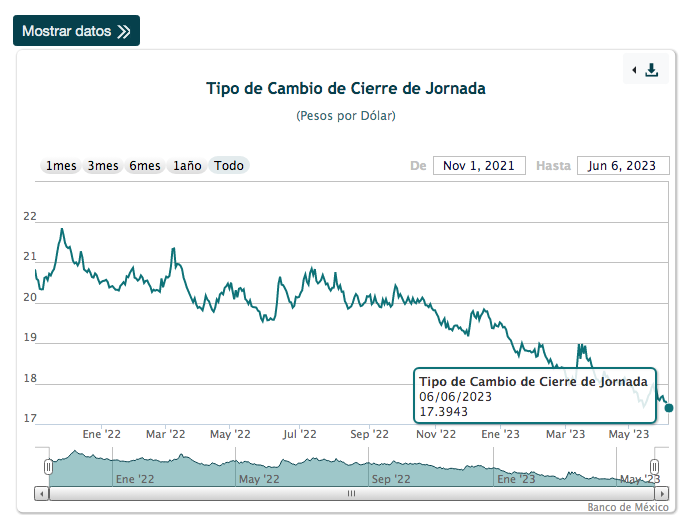 Ciudad de México, 6 de junio (SinEmbargo).– El peso mexicano finalizó la jornada en 17.39 unidades, su mejor nivel desde mayo de 2016 y marcó un nuevo mínimo frente al dólar en lo que va del 2023.