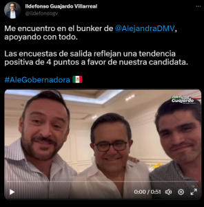 "Estamos viendo encuestas de salida muy favorables que están llevando a la realidad esto: tres o cuatro puntos arriba de nuestra candidata", dijo Guajardo en el video, hecho que era confirmado por dos elementos de la campaña de Alejandra del Moral.