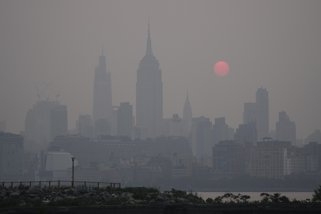 Edificios en Jersey City, Nueva Jersey, se ven parcialmente oscurecidos por el humo proveniente de incendios forestales en Canadá. Foto: Patrick Sison, AP.