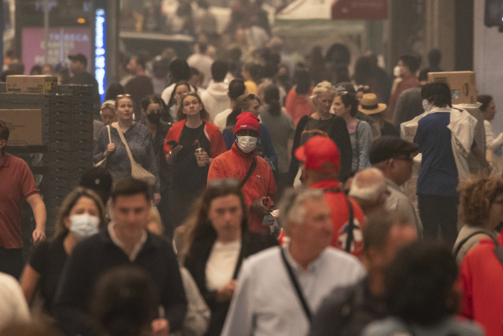 Algunas personas utilizan mascarillas mientras recorren el exterior de la plaza Herald invadida por humo en Nueva York, el miércoles 7 de junio de 2023. Foto: Yuki Iwamura, AP.