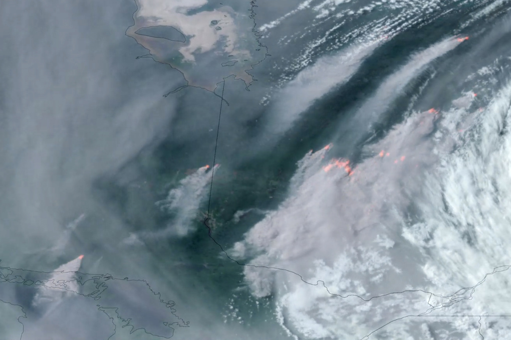 En esta imagen satelital tomada el martes 6 de junio de 2023 a las 6:40 hora del este de Estados Unidos y facilitada por CIRA/NOAA se distingue el humo. Foto: CIRA/NOAA vía AP.