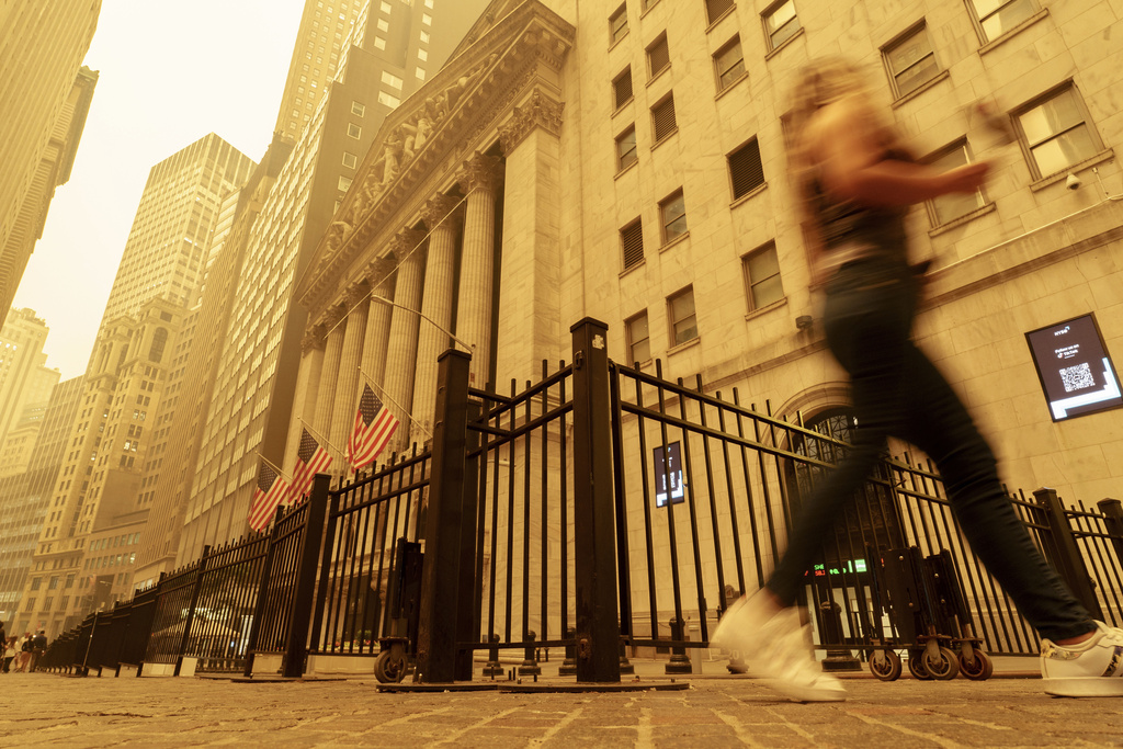 Una transeúnte camina entre el humo y la bruma cerca de la Bolsa de Valores de Nueva York, el miércoles 7 de junio de 2023. Foto: J. David Ake, AP.