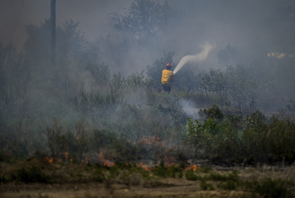 Los bomberos Walter Scott, a la izquierda, y Zac Simpson, combaten un incendio en el condado Shelburne, Nueva Escocia, el jueves 1 de junio de 2023. Foto: AP.