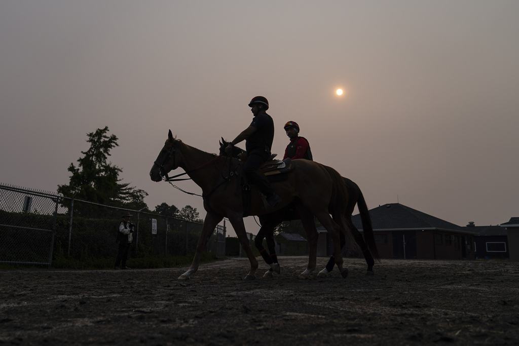 Una bruma causada por incendios forestales en el norte oscurece la salida del sol mientras jinetes se dirigen en sus caballos hacia la pista para la próxima carrera hípica Belmont Stakes en Belmont Park en Elmont, Nueva York, el miércoles 7 de junio de 2023. Foto: John Minchillo, AP.
