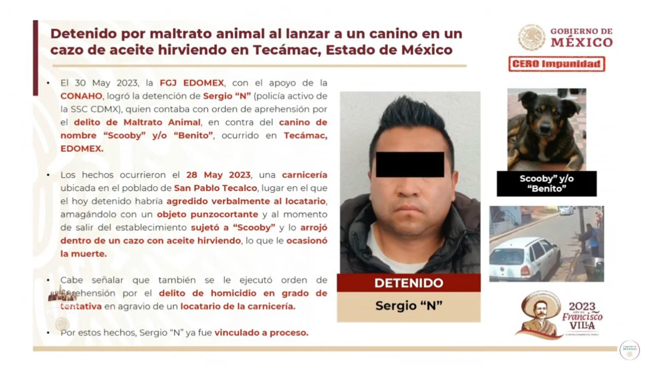 En la sección "Cero Impunidad" de la conferencia diaria matutina del Presidente Andrés Manuel López Obrador, Rodríguez Bucio detalló que Sergio "N", quien era policía activo en la Secretaría de Seguridad Ciudadana de la Ciudad de México (SSC-CdMx), fue vinculado a proceso por maltrato animal, y que también se le ejecutó otra orden de aprehensión por el delito de homicidio en grado de tentativa contra una persona.