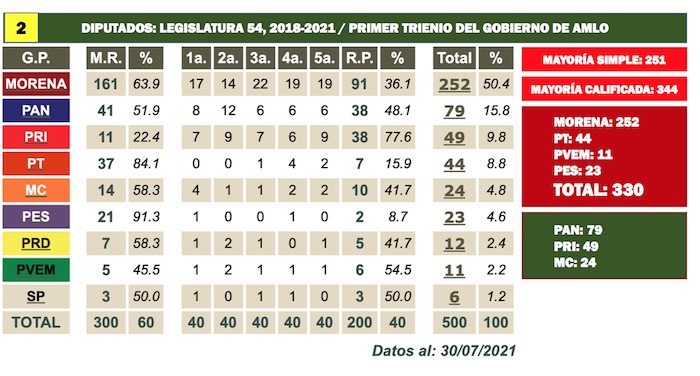 Para 2021, pese a mantenerse como primera fuerza, Morena vio reducida su presencia en el Congreso. De 252 diputados que tuvo en las elecciones del 2018 bajó a 200 en el 2021. En tanto, el PAN obtuvo 114, el PRI subió a 69 Diputados; el Partido Verde también ganó al lograr 41 diputados y el Partido del Trabajo 33.