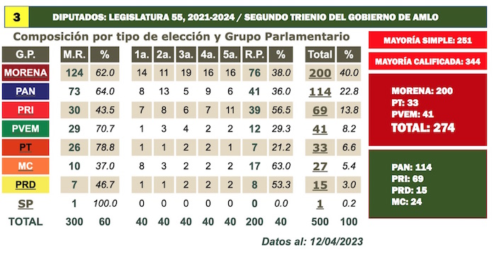 Es decir, los diputados de Morena y aliados suman 274 legisladores. ¿Esto qué significa? Que el oficialismo en la Legislatura que todavía está vigente sí puede modificar leyes secundarias. Es decir, puede reformar Leyes, pero no artículos de la Constitución.