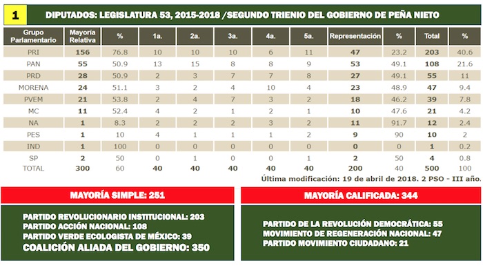 Pero, ¿los gobiernos anteriores tuvieron esta mayoría calificada en su recta final? En el último trienio del gobierno de Enrique Peña Nieto el Partido Revolucionario Institucional —del entonces Presidente— tenía 156 diputados de mayoría relativa y 47 de representación proporcional, es decir tenía un total de 203 diputados federales.