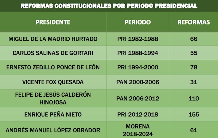 En el programa Puntos y Comas, que es transmitido en el canal de YouTube de SinEmbargo Al Aire, se detalló cómo en los últimos seis gobiernos anteriores al de López Obrador la Constitución Política de los Estados Unidos Mexicanos sufrió 495 reformas. Miguel de la Madrid Hurtado la modificó 66 veces; Carlos Salinas de Gortari, 55 veces; Ernesto Zedillo Ponce de León, 78 veces; Vicente Fox Quesada, 31 ocasiones; Felipe de Jesús Calderón Hinojosa hizo 110 cambios, y Enrique Peña Nieto, 155.