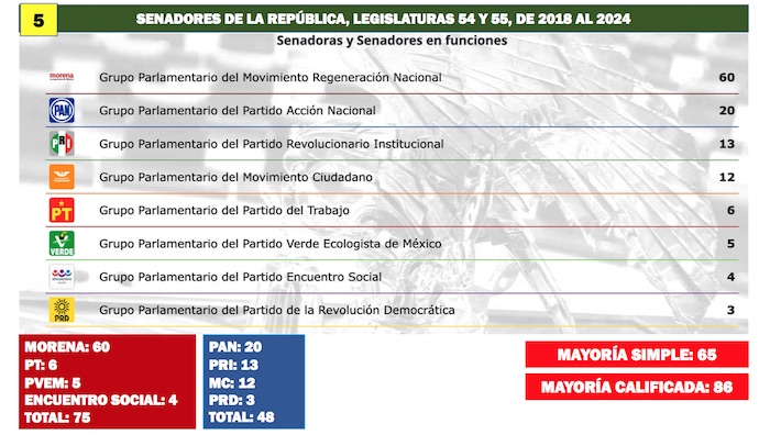 En el actual Senado, Morena tiene 60 senadores, el PT tiene seis, el Partido Verde cinco, el Partido Encuentro Social cuatro. Entre todos suman 75 senadores, 11 votos menos que los necesarios para modificar la constitución.