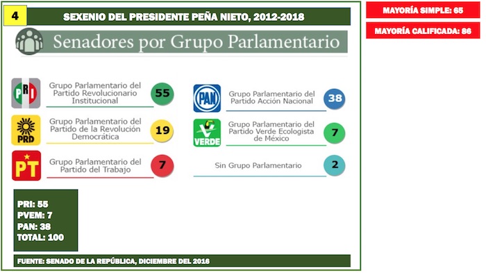 Cuando cerró el Gobierno de Peña Nieto, en la Cámara Alta el PRI tenía 55 senadores, el Partido Verde 7, y Acción Nacional, 38 senadores. Es decir, entre los tres tenían 100 senadores. Para la mayoría calificada en el Senado solamente se necesitan 86 votos.