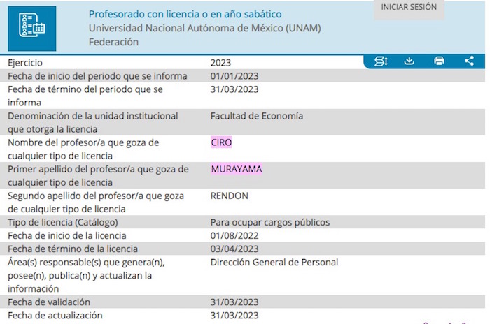 Murayama Rendón no cumple este requisito ya que, como se puede consultar en la Plataforma Nacional de Transparencia, hasta el 31 de marzo pasado se encontraba de licencia en sus labores en la Facultad de Economía por el cargo que desempeñó como Consejero del INE, durante casi una década.