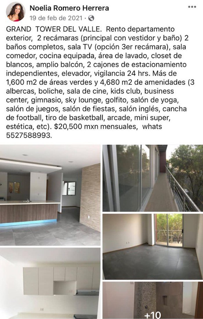 Noelia Romero Herrera, hermana del coordinador de los diputados federales del PAN, es propietaria también de al menos un departamento en City Towers, como ella mismo lo promocionó en su página de Facebook, en 2021.