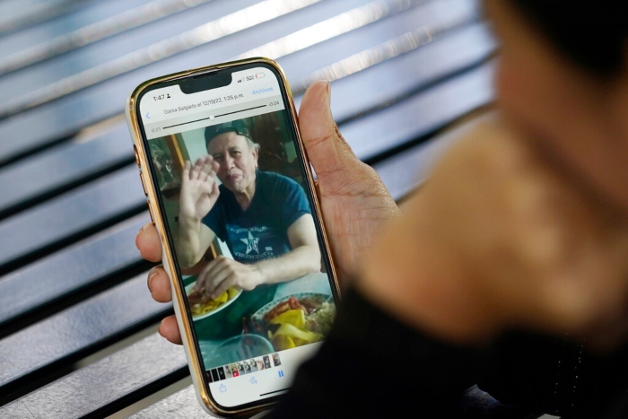 Sarah Salgado reproduce un video de su padre durante un descanso del trabajo en Miami Lakes, Florida, el lunes 19 de diciembre de 2022. Foto: Marta Lavandier, AP.