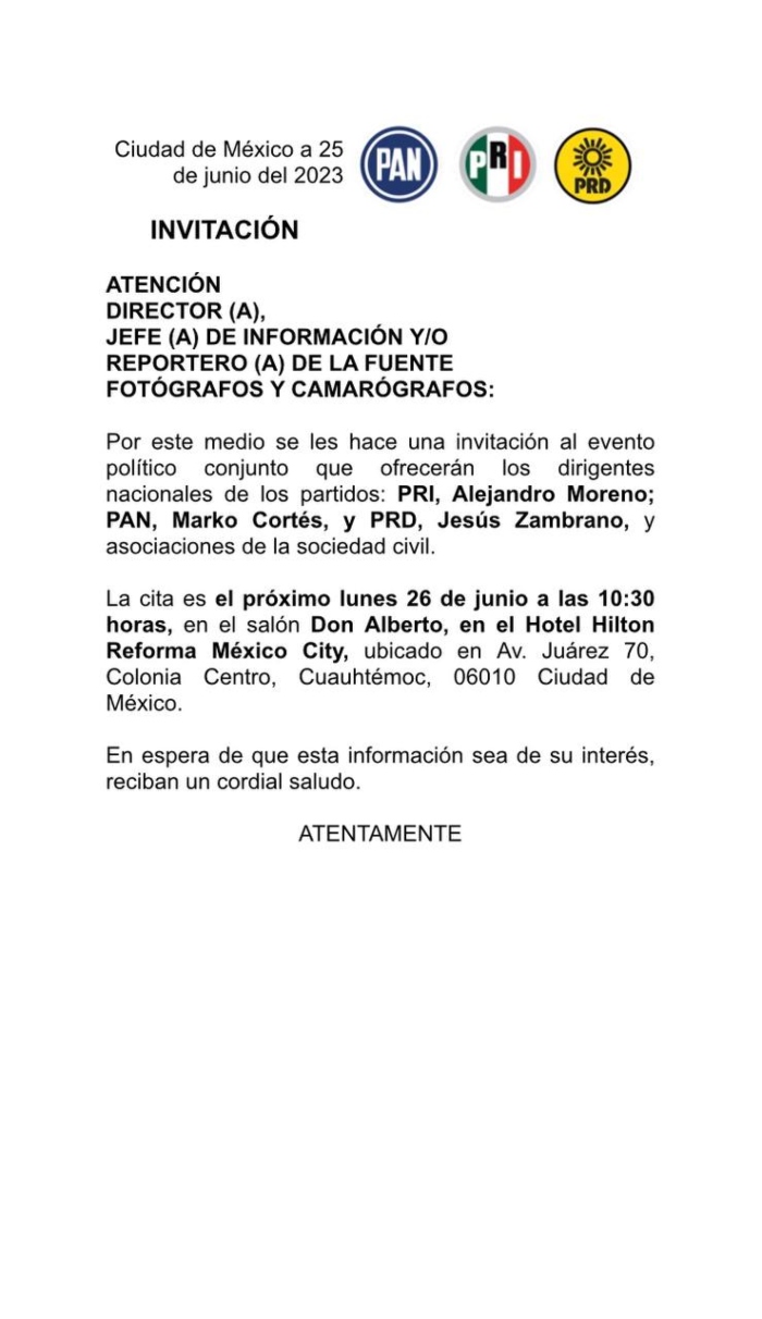 Dicho método de selección para entregar la candidatura presidencial de la oposición fue aprobado ayer por los tres partidos y será mañana cuando lo den a conocer oficialmente durante una conferencia de prensa. Hace unas horas, los dirigentes Marko Cortés (PAN), Alejandro Moreno (PRI) y Jesús Zambrano (PRD) enviaron la invitación del evento a medios de comunicación. La cita es a las 10:30 horas en el Hotel Hilton Reforma, ubicado en la Ciudad de México.