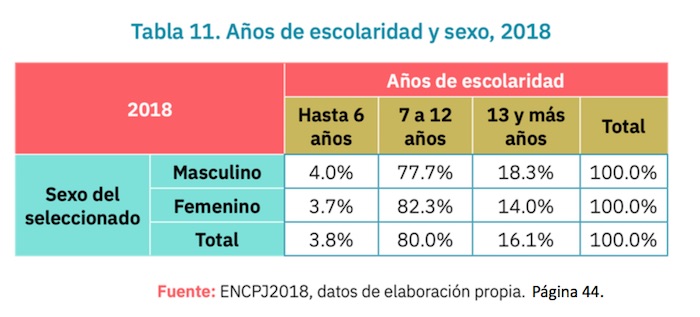 Si consideramos el nivel escolar, en la muestra de 2018, encontramos que la mayoría de jóvenes se ubica entre los 7 y los 12 años de escolaridad: 77.7 por ciento mujeres y 82.3 por ciento hombres, dando un total de 80 por ciento de jóvenes que han estudiado la primaria o secundaria. Mientras que el 16.1 por ciento ha cursado 13 años o más y el 3.8 por ciento sólo ha cursado hasta 6 años.