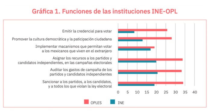 Ahora, qué tanto saben los jóvenes sobre los órganos electorales. En la gráfica 1 se aprecia que la gran diferencia entre el INE y los OPL no está en las funciones específicas que se atribuyen a cada organismo, sino en los que están desinformados. Asimismo, se observa que más de la mitad de los entrevistados tiene confusión respecto de las funciones que corresponden a cada institución, ya que también piensan que “emitir la credencial para votar” es responsabilidad tanto de los OPL como del INE.