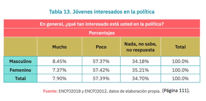 Esta precarización de servicios, añade, genera incertidumbres y una notable desconfianza de los jóvenes hacia los cuerpos institucionales de la política que se refleja no sólo en “una apatía de participación cívica”, sino también se marca en el rechazo a las formas más convencionales de la política, por lo que cabe preguntarse si los jóvenes son apáticos y apolíticos por sí mismos, o por encontrarse en un contexto de abandono de las políticas públicas.