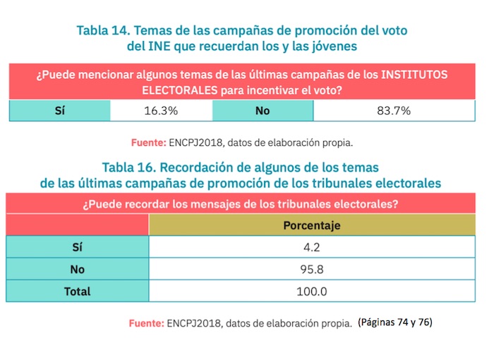 Ahora, cuando los jóvenes fueron cuestionados sobre si podían mencionar algunos temas de las últimas campañas de los institutos electorales para incentivar el voto, el 83.7 por ciento dijo que no. En cuanto, a si recordaban los mensajes de los tribunales electorales, el 95.8 respondió también que no.