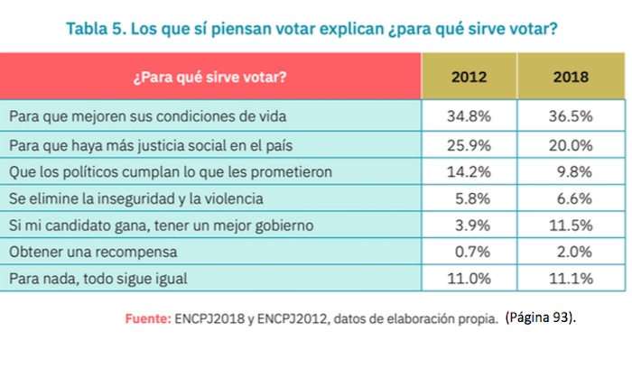 En ese sentido, el 36 por ciento de los jóvenes vota con la ilusión de que mejoren sus condiciones de vida; el 20 por ciento para que haya más justicia social en el país; el 11.5 por ciento para tener un mejor gobierno; el 11.1 por ciento para nada, 9.8 por ciento para que los políticos cumplan lo que les prometieron; el 6.6 por ciento para que se elimine la inseguridad y la violencia, y el 2 por ciento para obtener una recompensa.