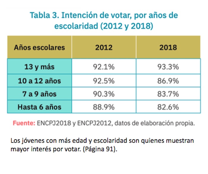 Los resultados muestran que son los jóvenes con más edad y escolaridad quienes muestran mayor interés por votar. Al respecto, el 93.3 por ciento de aquellos con 13 años escolares y más manifestó su intención de hacerlo, mientras que sólo el 82.6 por ciento de quienes tenían hasta 6 años escolares mostró su interés en acudir a las urnas.
