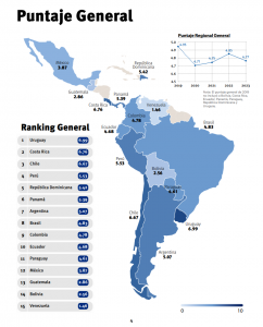 De los 15 países, Guatemala y Venezuela experimentaron las caídas más significativas en sus puntajes en el último año, del 15 por ciento y 10.4 por ciento respectivamente. Panamá, en cambio, registró una mejora sustancial del nueve por ciento en términos interanuales, a 5.39 puntos.