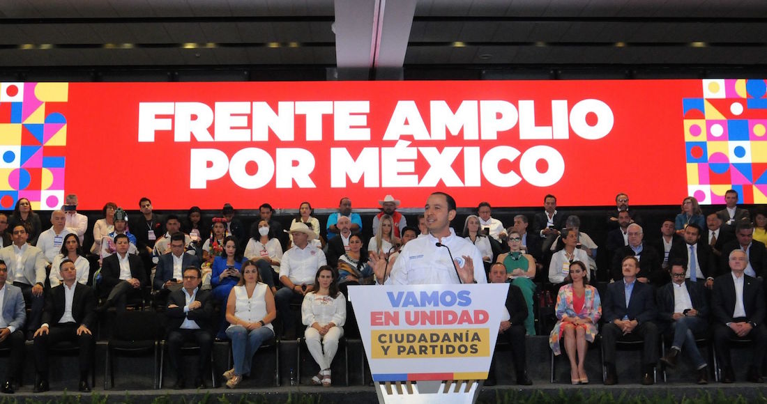 Los partidos Acción Nacional, Revolucionario Institucional y de la Revolución Democrática, así como organizaciones afines que ellos llaman “sociedad civil”, presentaron ayer el Frente Amplio por México que, al menos por ahora, sustituye a Va por México, su representación propiamente electoral. “A diferencia de Morena, nosotros sí vamos a respetar la Ley”, dijo Marko Cortés. Las referencias a Andrés Manuel López Obrador y al movimiento de izquierda fueron una constante. El Frente, al parecer, será el encargado de elegir a su candidata o candidato para 2024. “¡No nos van a ganar, los vamos a detener!”, subrayó Alejandro Moreno Cárdenas, con emoción.