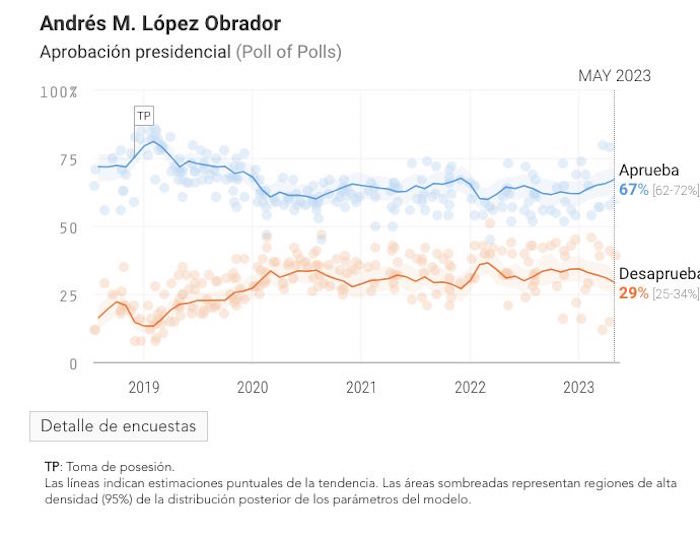 Las cifras del ponderado Oraculus que da seguimiento y agrega los resultados de las principales encuestas públicas de aprobación presidencial, muestran que la popularidad de López Obrador al corte del 30 de mayo pasado era del 67 por ciento, un nivel superior al que han registrado para estas fechas los últimos tres presidentes.