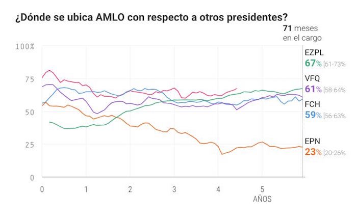Los datos del polls of polls de Oraculus muestran que en el mes 71 de su gobierno, Enrique Peña Nieto tenía una aceptación de 23 por ciento, Felipe Calderón Hinojosa del 59 por ciento y Vicente Fox Quesada del 61 por ciento. Sólo el priista Ernesto Zedillo Ponce de León mantenía en el mismo periodo la misma popularidad que López Obrador.