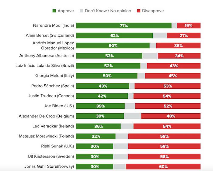 A nivel internacional, de acuerdo con la encuesta de líderes globales que realiza Morning Consult Political Intelligence (MCPI) entre presidentes y primeros ministros de 22 países, López Obrador cayó al tercer lugar, detrás de Narendra Modi de la India (77 por ciento) y Alain Berset de Suiza (62 por ciento). Aún así el Presidente mexicano es el mejor posicionado de toda América con un 60 por ciento de aceptación.