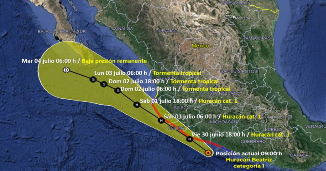 Esta noche, el centro del #Huracán #Beatriz de categoría 1 en la escala Saffir-Simpson, se ubicó a 80 km al sur-sureste de Manzanillo, #Colima, y a 185 km al sureste de Playa Pérula, #Jalisco. Sus bandas nubosas mantendrán condiciones para #Lluvias puntuales torrenciales en… pic.twitter.com/n5FUqfgzvU