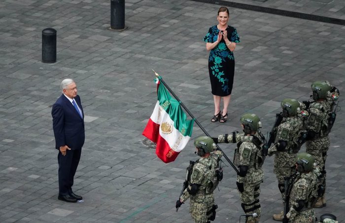 Aunque estaba programado que el acto conmemorativo iniciaría a las 17:00 horas, fue hasta 26 minutos después que el Presidente salió de Palacio Nacional y subió al templete instalado en la plancha del Zócalo.