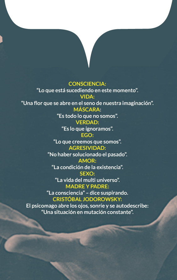 Jodorowsky fija la mirada al infinito, como mirando y afirmando sus convicciones y exclama: “Eso de “no conciliable” es falso porque nosotros somos dos dimensiones, esa es nuestra condición humana. Cuando uno trata de fragmentar alguno de nuestros lados, estamos cometiendo un crimen. Estamos en una época en la que la física dice: “unificación de la materia”. Ya el pecado de la carne se acabó, la tierra como purgatorio, se acabó; el cielo y el infierno se acabaron. Es una sola energía. Entonces, ya estamos conciliados y la gente tiene que tomar consciencia de lo que somos y dejar atrás todas esas estructuras que fueron necesarias, pero que ya no lo son. Lo del pasado fue útil, pero ya hay una nueva visión de lo que es el ser humano y eso hay que asumirlo”.