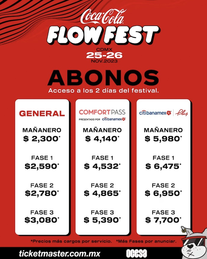 En el caso del Flow Fest 2022, la situación no es muy diferente. El abono general iba de los mil 880 pesos en las primera fase, 2 mil 180 en la segunda y hasta los 2 mil 380 pesos en la tercera. En el caso del Confort Pass el precio iba de los 3 mil 390 pesos en primera fase, 3 mil 940 en la segunda y 4 mil 290 en la tercera. Finalmente el costo del abono Plus oscilaba entre los 4 mil 900 pesos en fase 1, 5 mil 700 en la segunda y 6 mil 200 pesos en la tercera. Todos estos precios no incluían los cargos por servicio.