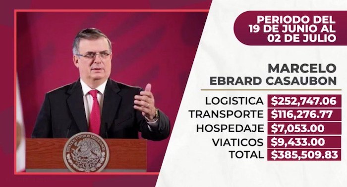 Delgado detalló que Marcelo Ebrard reportó gastos de 252 mil 747 pesos en logística, “es todo lo que se necesita para organizar un evento”, explicó; en transporte 116 mil 276 pesos; siete mil 053 pesos en hospedaje; y en viáticos, nueve mil 433 pesos, lo que da un total de 385 mil 509 pesos.