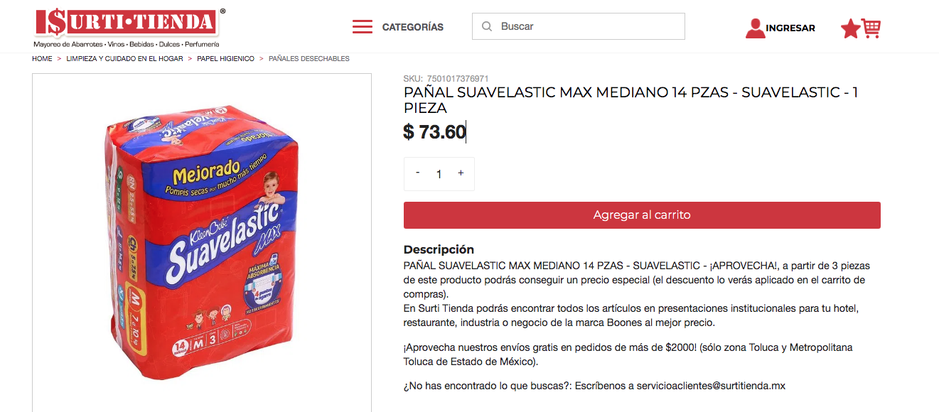 Por ejemplo, el precio del paquete de pañales Kleen Bebé Suavelastic Max Mediano con 14 piezas, fue comprado por Diconsa en 220.62 pesos cada pieza, cuando en tiendas de autoservicio como Surtitienda y Princo se venden al cliente en 73.60 y 64 pesos IVA incluido, respectivamente. Es decir, un sobreprecio de 199.75 por ciento.