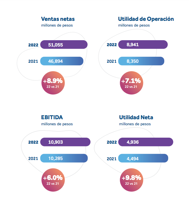 La utilidad neta de la empresa de Claudio X. González Laporte alcanzó el año pasado 4 mil 936 millones de pesos, un avance de 10 por ciento con respecto al año pasado, mientras que el flujo operativo (Ebitda) en este periodo fue de 10 mil 903 millones de pesos, un crecimiento de 6 por ciento en comparación con 2021.