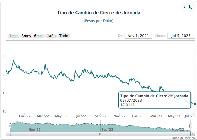 Ciudad de México, 5 de julio (SinEmbargo).- Luego de romper el piso de las 17 unidades, el peso mexicano presentó correcciones y finalizó en 17.0141 pesos por dólar, de acuerdo con las cifras del Banco de México (Banxico), una apreciación de 0.25 por ciento o 4.21 centavos respecto a su último cierre.