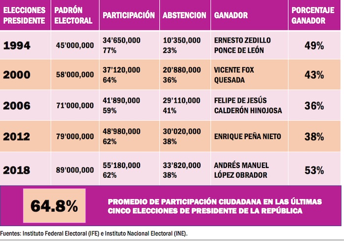 Ahora bien, la Lista Nominal de potenciales votantes, actualizada al 29 de junio del 2023, es de 95 millones 322 mil 515 personas. El promedio de participación de las últimas cinco elecciones presidenciales ha sido del 64.8 por ciento, es decir alrededor de 61 millones 768 mil 989 sufragantes.